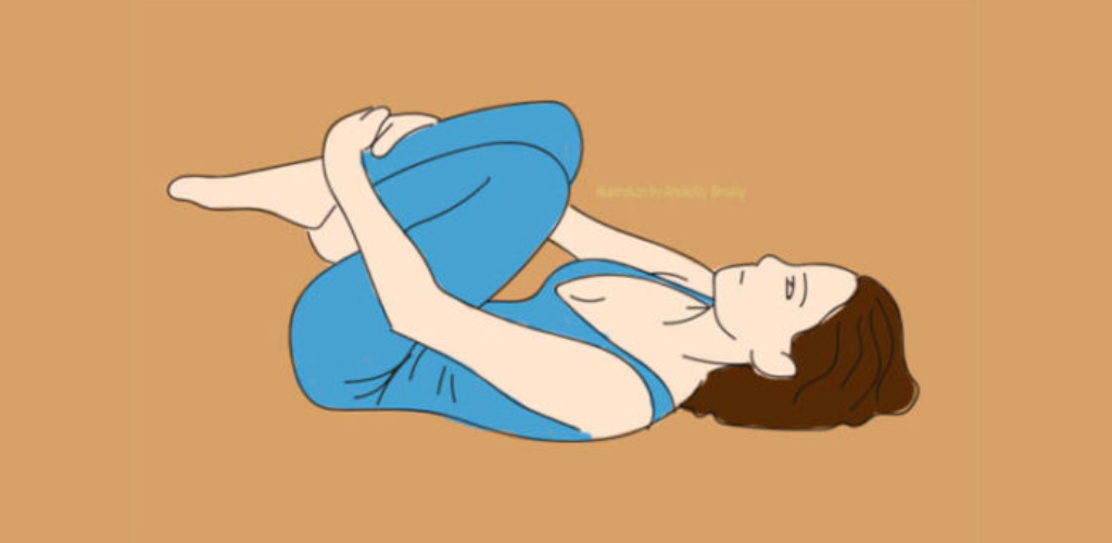 Лягаємо на спину. Ноги згинаємо в колінах та підтягуємо ближче до грудей. Охоплюємо ноги руками та затримуємося в такому положенні на 60-90 секунд. Виконуємо вправу ще 5 разів з 15-секундною перервою.